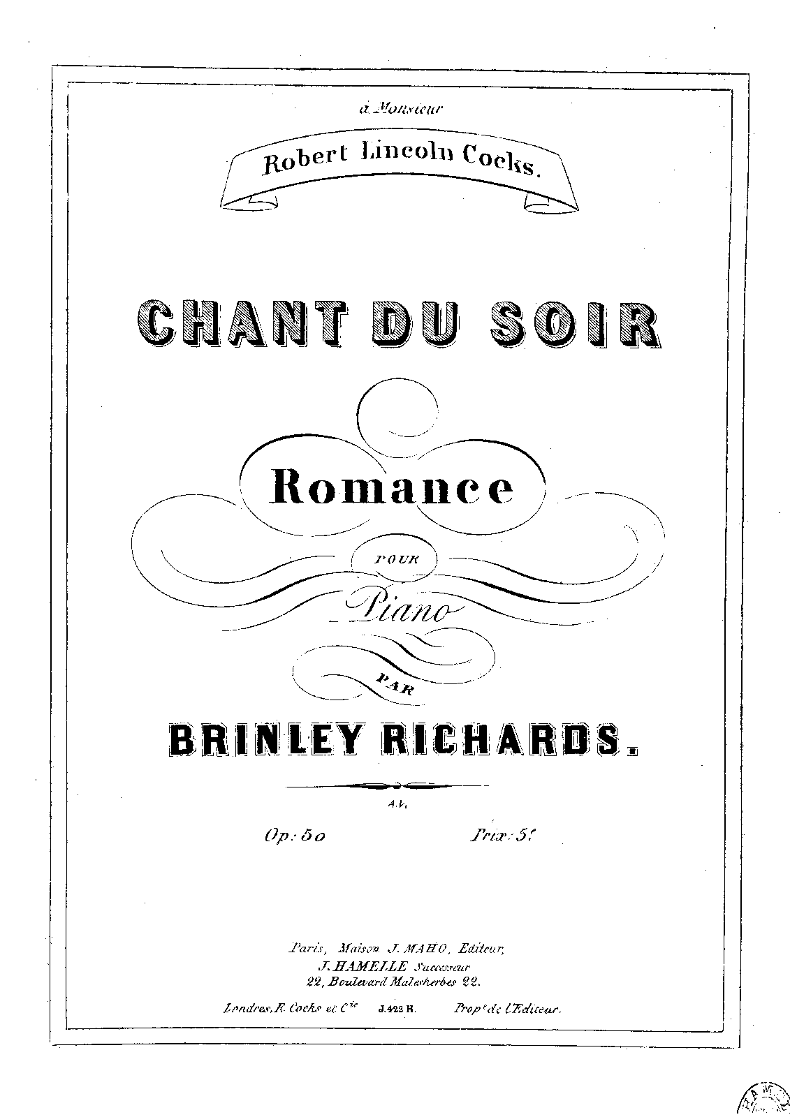 Published under title "Warblings at Eve" by Cocks in 1858, under title "Am Abend, Romanze" by Wessely in 1860, under title "Chant du Soir" by Maho in 1862.