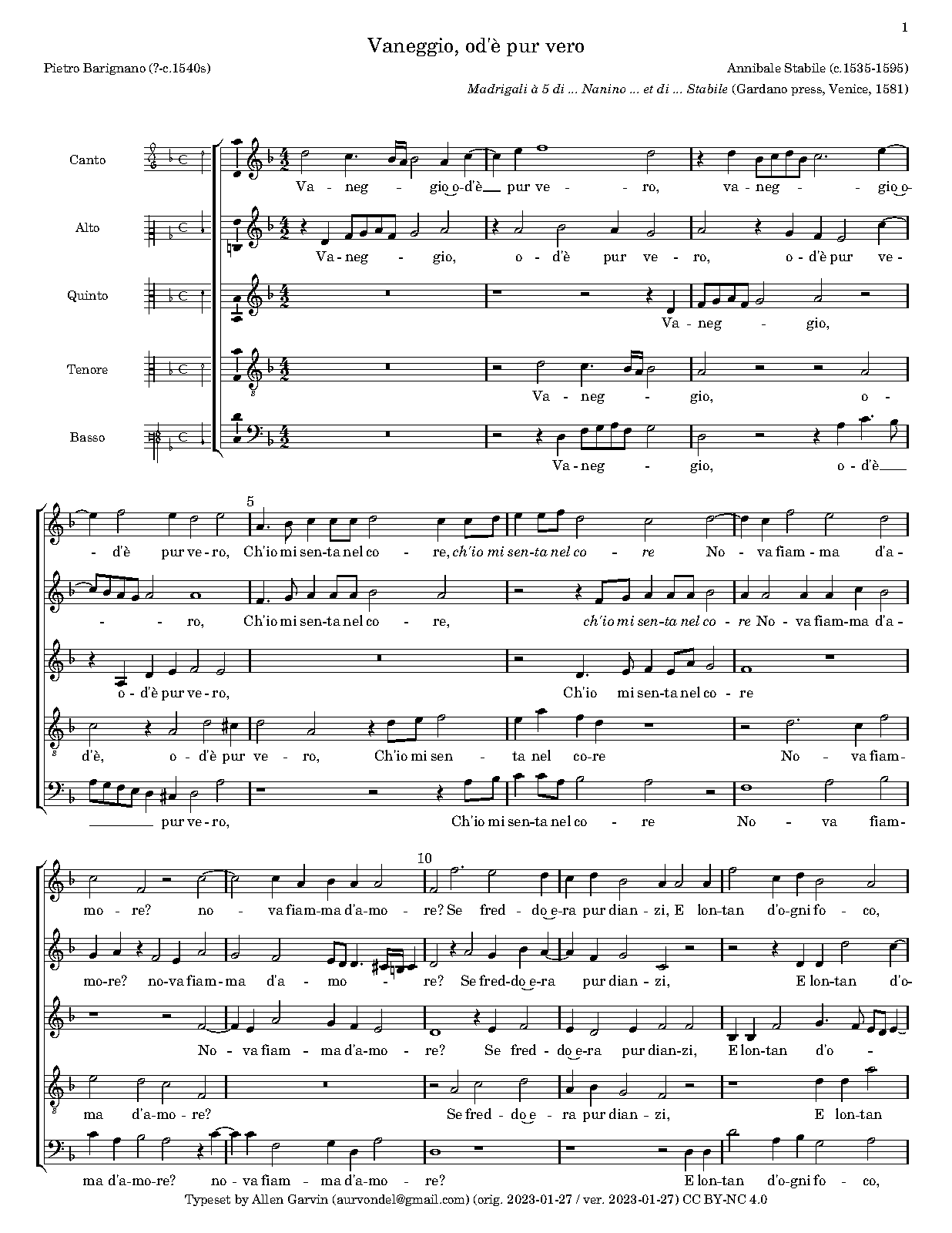 | First Publication | 1581 in Madrigali a 5 voci di Gio. Maria Nanino e di Annibal Stabile (Venice: Angelo Gardano) (No.6) |