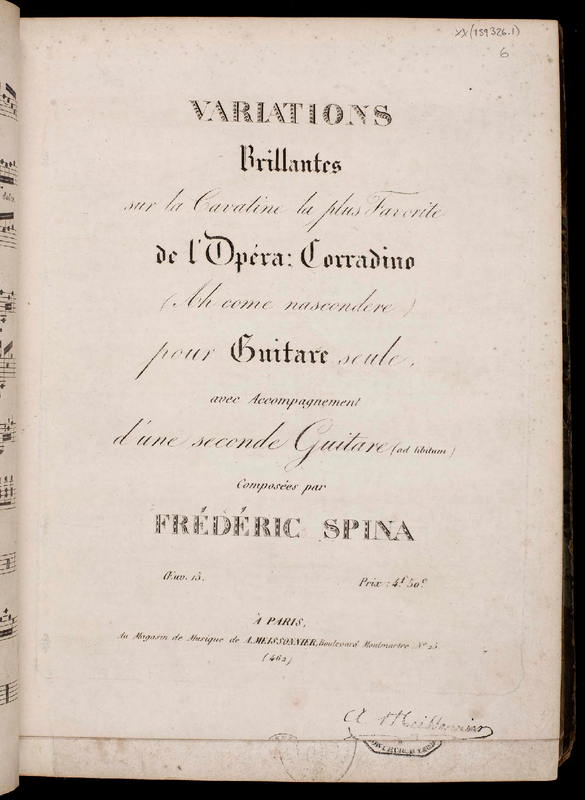 | Alternative. Title | Variation Brillante sur la Cavatine la plus favorite de l'Opera Corradino (Ah come nascondere) pour Guitare seul avec accompagnement d'une seconde Guitare (ad libitum) |