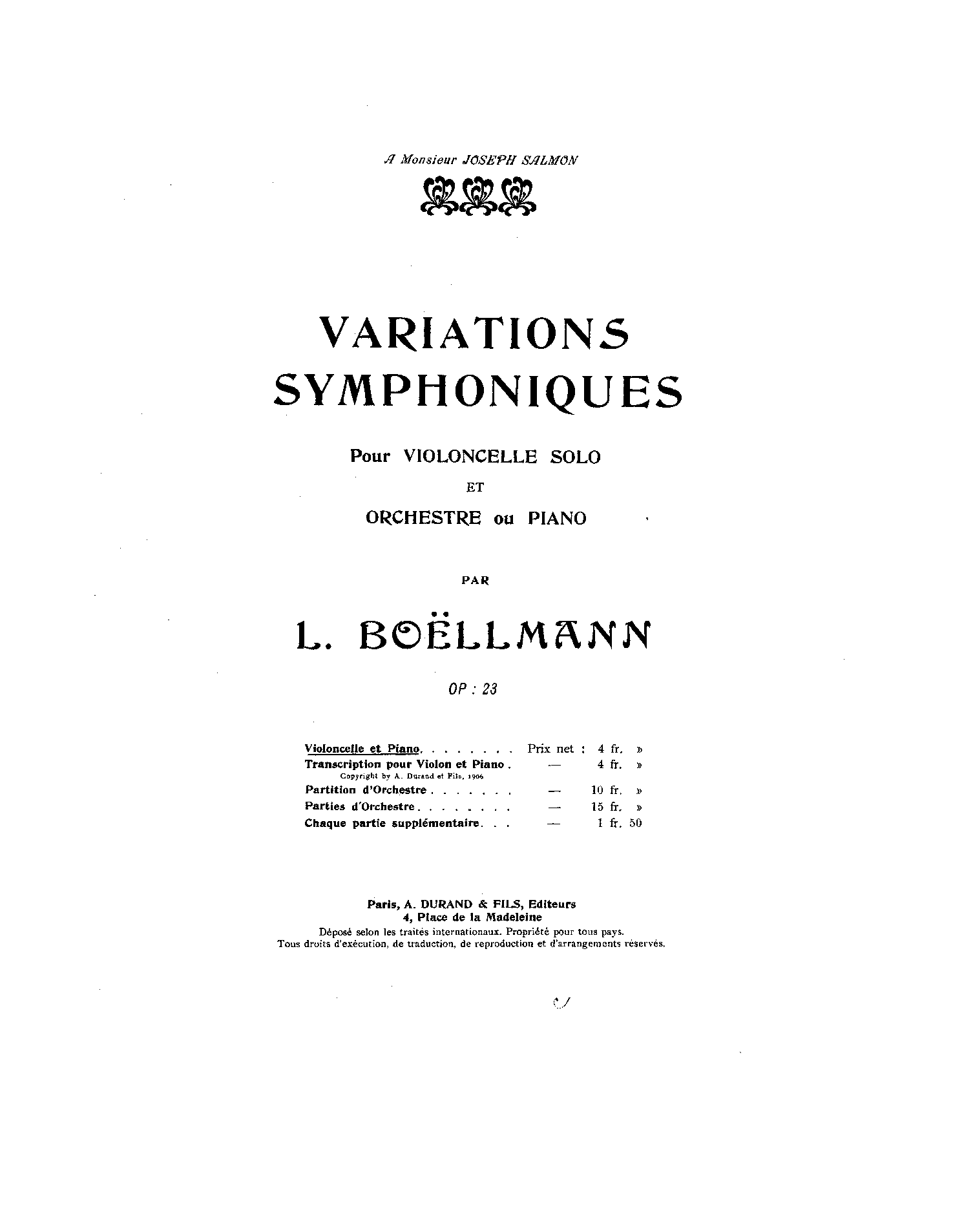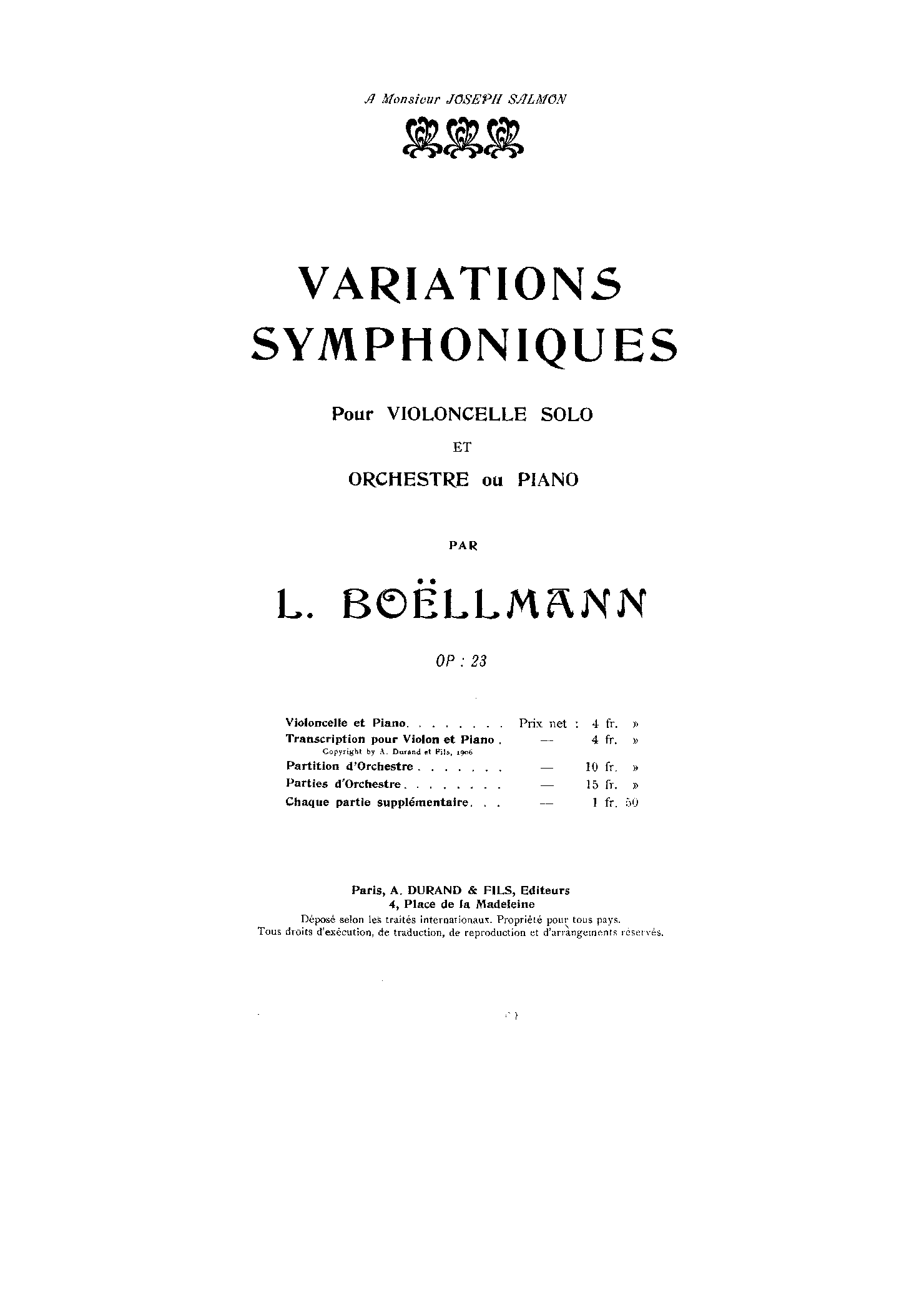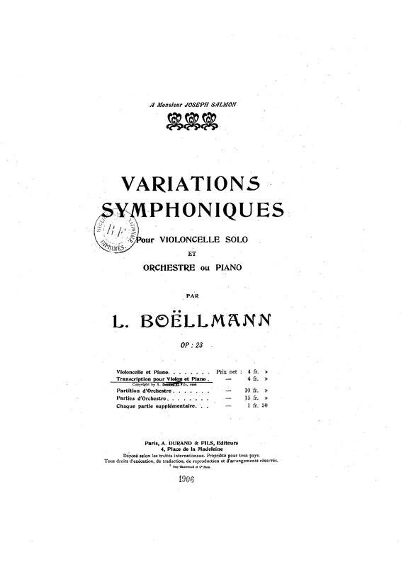 | Alternative. Title | Variations Symphoniques pour Violoncelle Solo et Orchestre ou Piano Symphonic Variations for Cello solo and Orchestra or Piano, Op.23 |