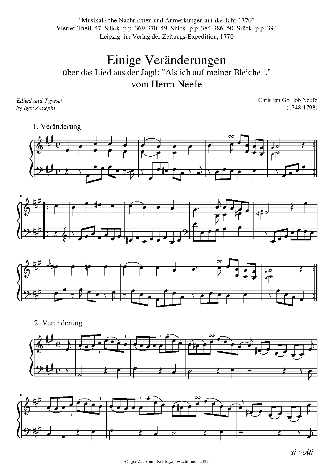| Alternative. Title | Einige Veränderungen über das Lied aus der Jagd: "Als ich auf meiner Bleiche" vom Herrn Neefe |