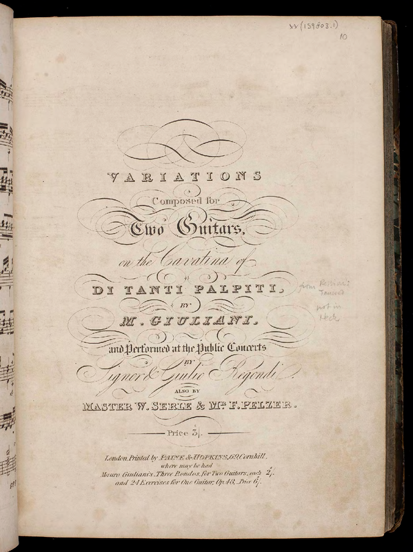 | Alternative. Title | Variations composed for two Guitars on the Cavatina of 'Di Tanti Palpiti' by M. Giuliani and performed at the public concerts by Signor & Gulio Regondi, also by Master W. Serle & Mr. F. Pelzer |