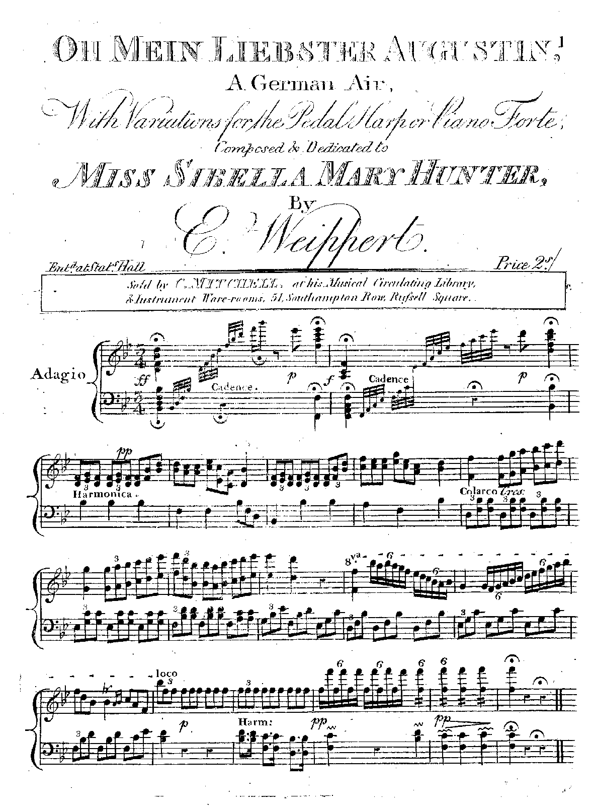 | Work Title | Oh Mein Liebster Augustin. A German Air. With Variations for the Pedal Harp or Piano Forte |