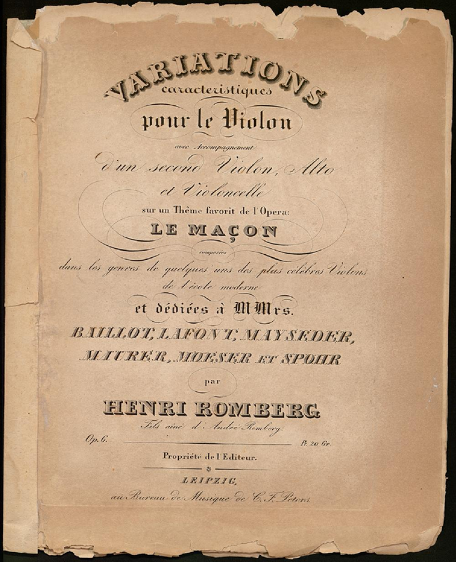 | Alternative. Title | Variations caracteristiques pour le Violon avec Accompagnement d'un second Violon, Alto et Violoncelle sur un Theme favorit de l'Opera Le Maçon composees dans les genres de quelques uns des plus celebres Violons de l'ecole moderne |