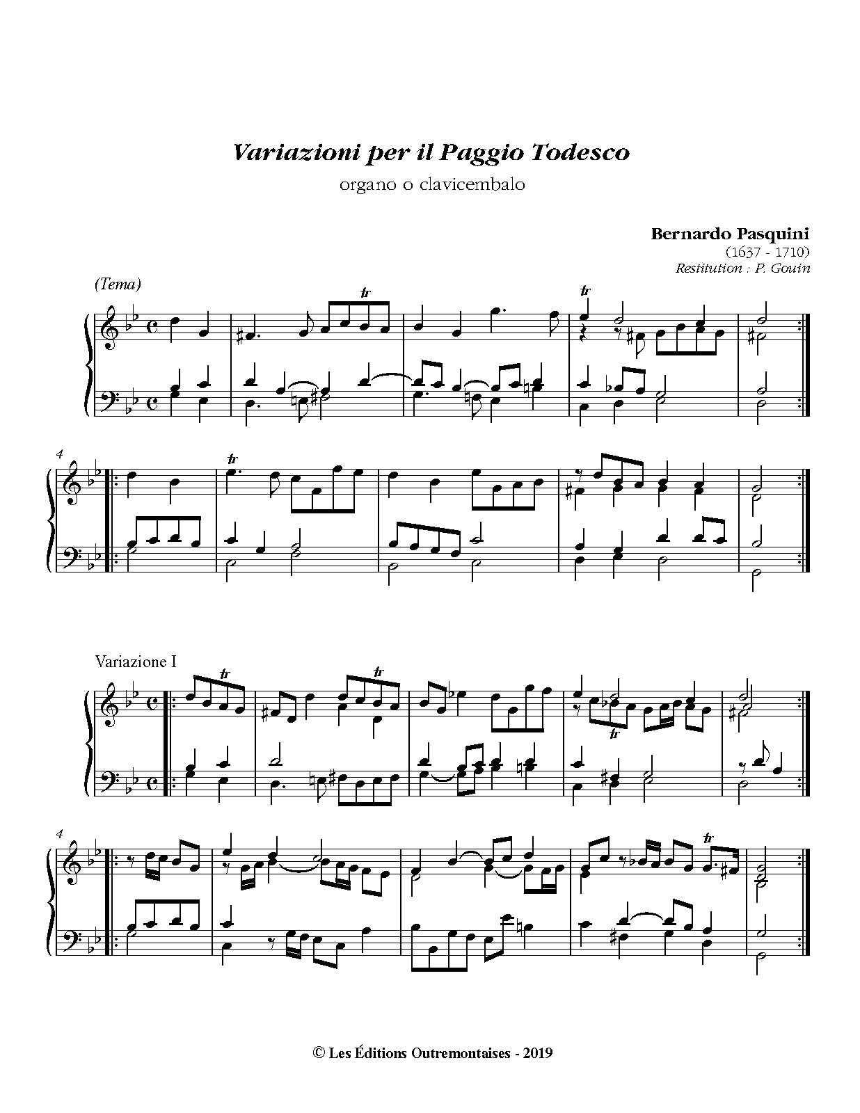 Although the title in the autograph manuscript (Berlin, SBPK, ms. Landsberg 215) seems to be Variazioni per il Paggio Todesco, most recordings and concert programs mention this piece as Variazioni per il paggio tedesco (variations for the german pageboy), by analogy with similar dedications in the manuscript (e.g. per l'Inghlese de Scotia, per Spagna, per il Francese, ...). Joel Speerstra gives an interesting interpretation of these 'dedications' in the Pasquini Symposium 2010 (pp.256-260).