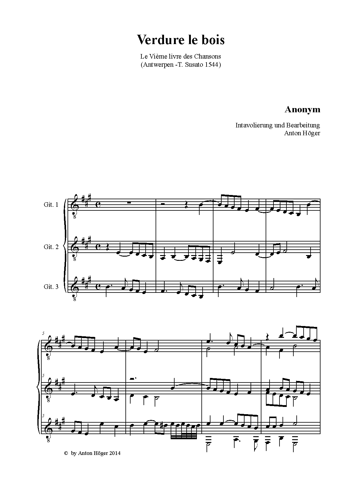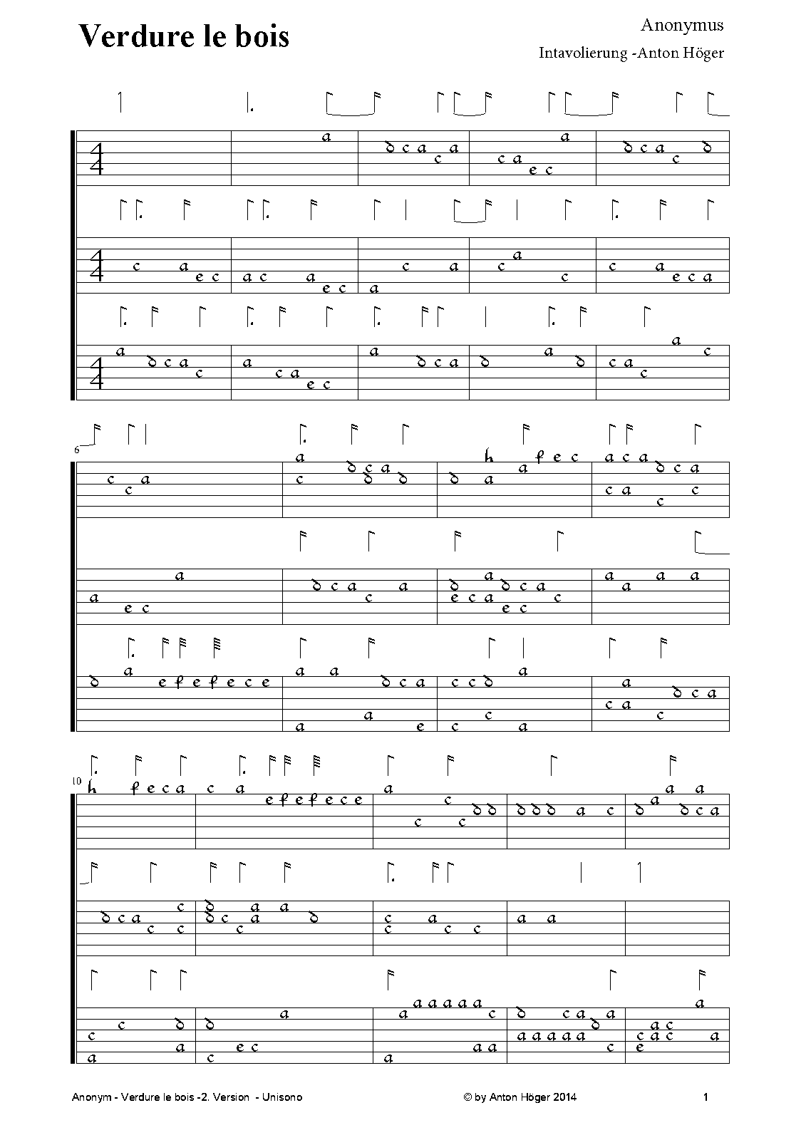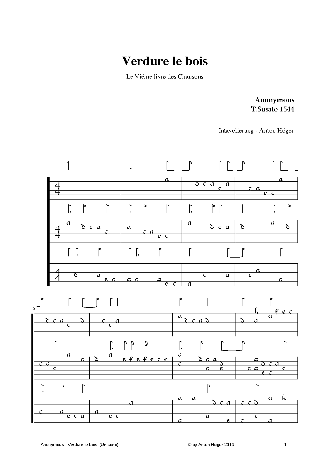 Intabulation in French lute-tablature (Unisono). Each lute has 2 lines. Good for practising. If performed I would look forward about a small reference to my efforts.