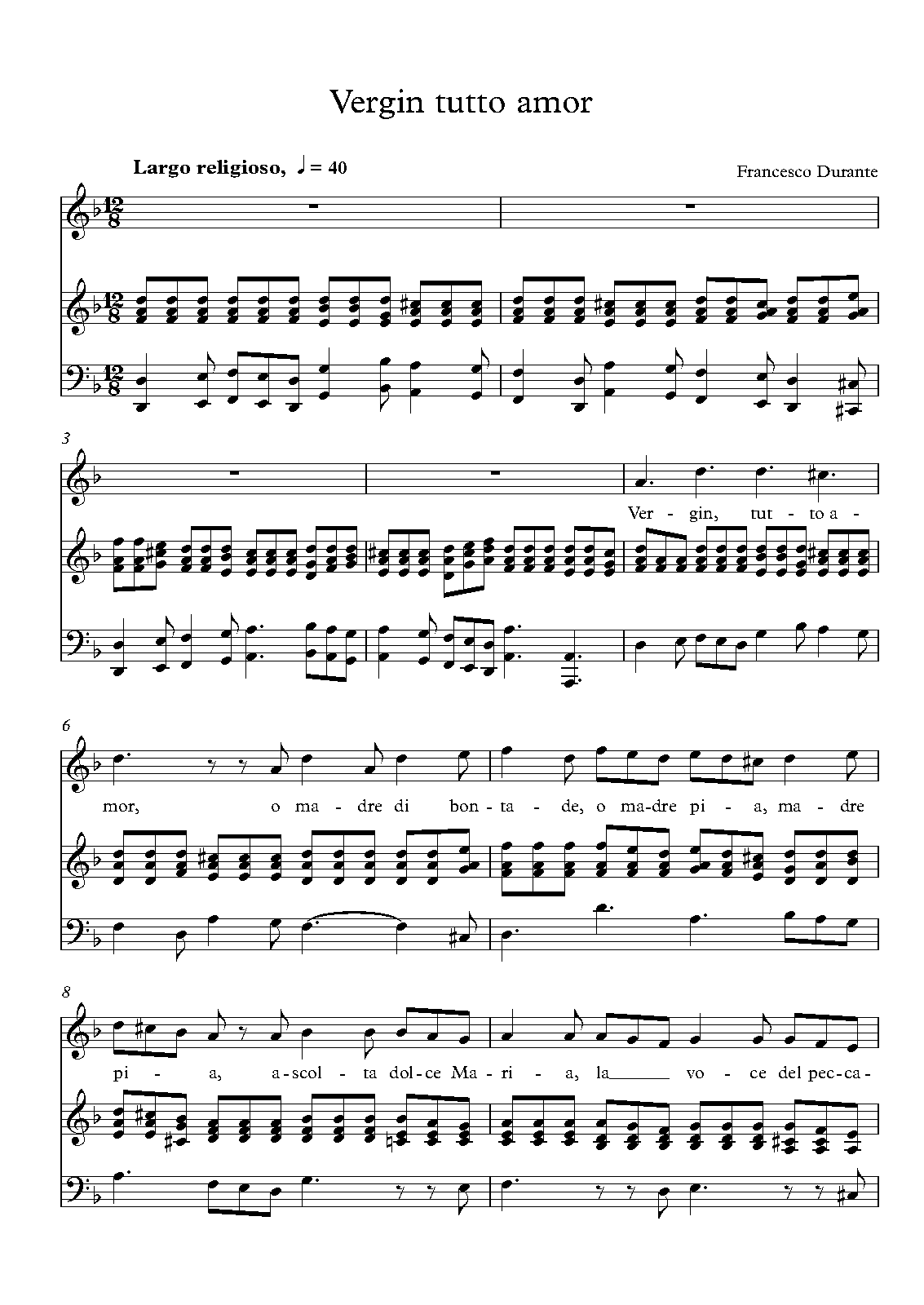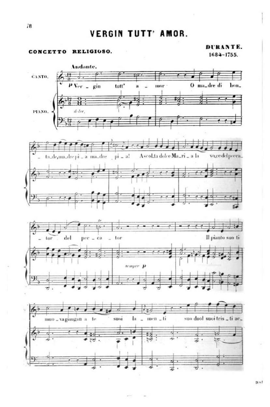 "Vergin tutt' amor" (thus!) ("Vergin tutto amor" is grammatically incorrect, although Vergin tutta amor is acceptable), initially published without even a title as a wordless solfeggio (tempo Andante in D minor) with a bass continuo accompaniment in Solfeges d'Italie,1772 no.128 to which text and harmony first time anonymously appeared only in Echos d'Italie vol.6,1874.