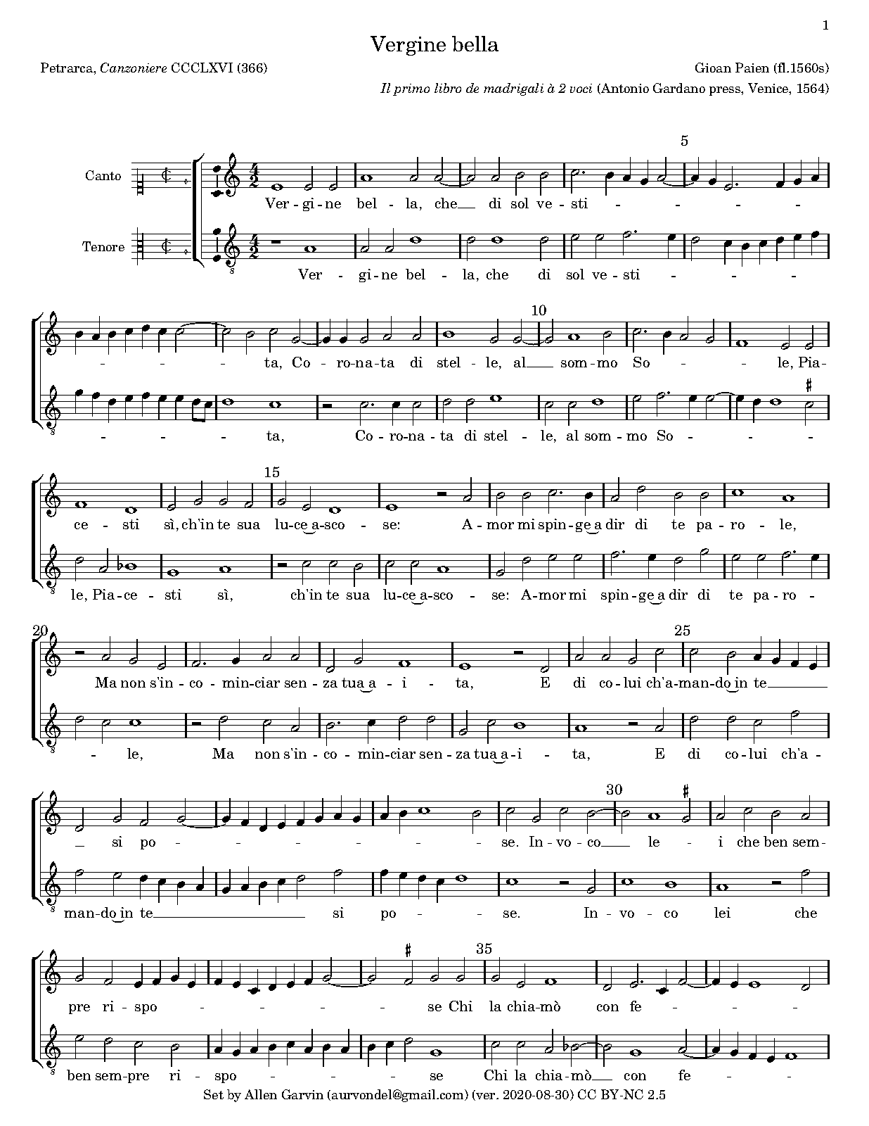 | First Publication | 1564 in Il primo libro de madrigali à 2 voci (Venice: Antonio Gardano press), no.1 |