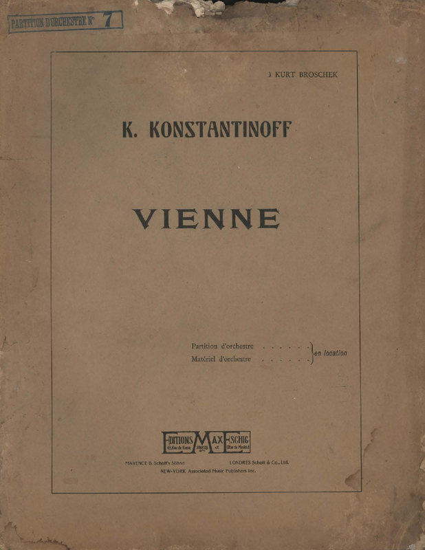 This complete proof edition is part of the Konstantinoff archives, and is the second of two versions therein. A prior version is in an even worse condition, eaten away by humidity and mould, due to the dire circumstances in which they were found (see the uploader's talk page for details). This score bears the number 7, which may mean anything. The composer, who dedicated his work to the Hamburg publisher Kurt Broschek, intended it as a gift copy for his "mentor and friend", Eugène Bigot, as the signed autograph on page 2 testifies. Eugène Bigot (1888-1965) enjoyed a distinguished career as a conductor and pedagogue and was probably instrumental in K.Konstantinoff being appointed as the conductor of the Orchestre National de la Radio during the war years, since Bigot had contributed toward its foundation, together with Inghelbrecht, in 1934.