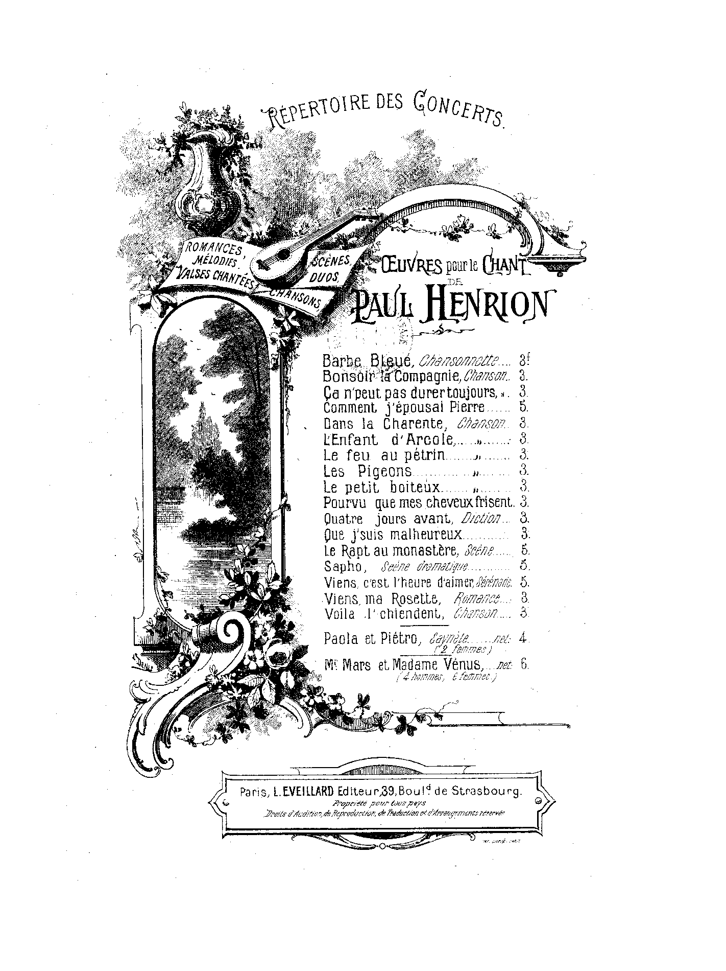 | Genre Categories | Chansons; Songs; For voice, piano; |