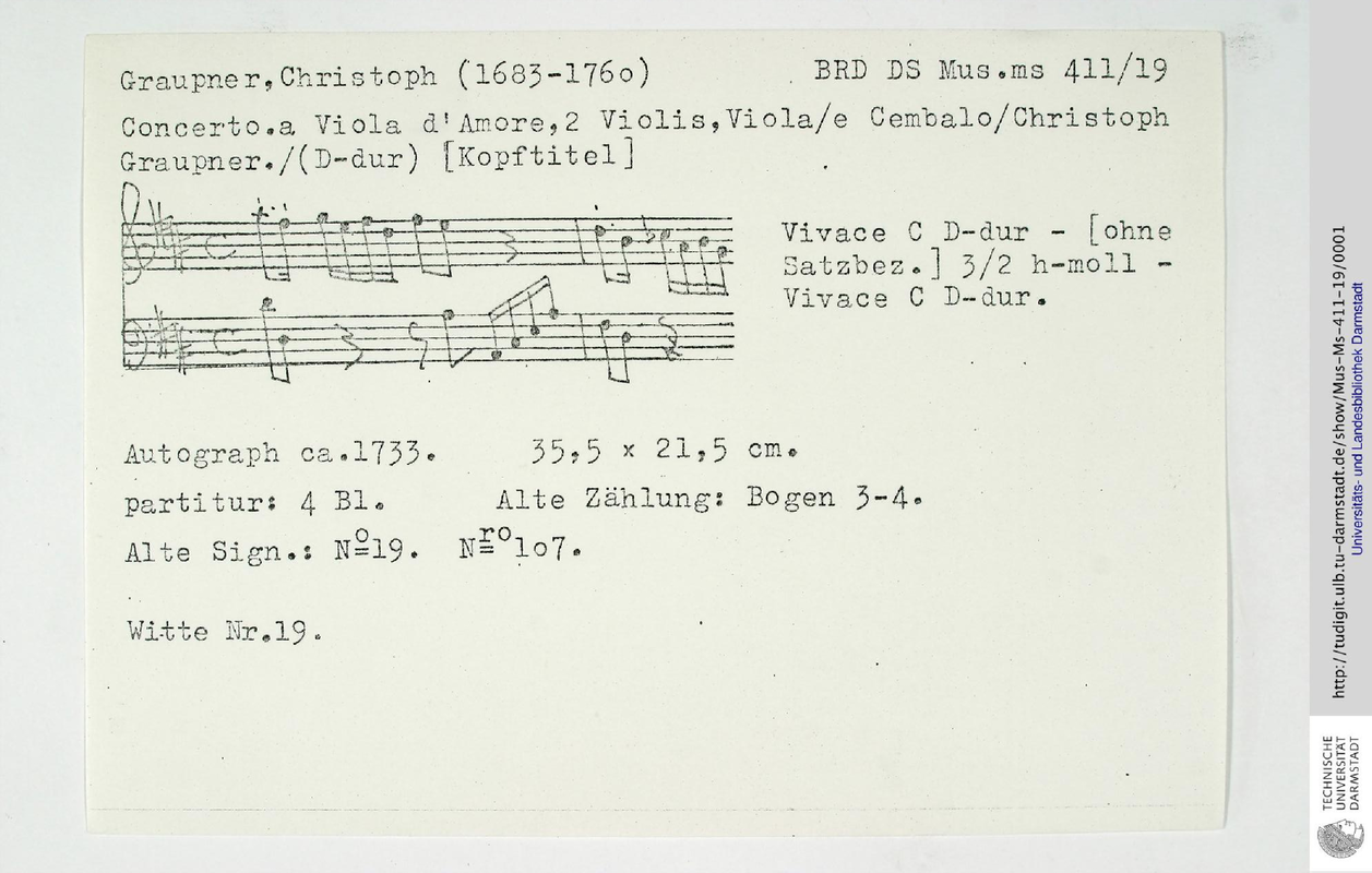 | Genre Categories | Concertos; For viola damore, strings, continuo; Scores featuring the viola damore; |