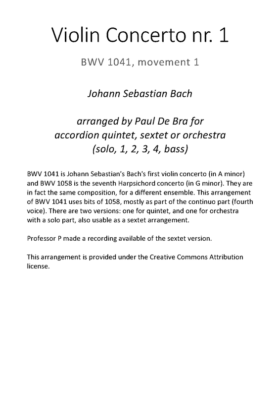 Misc. Notes 5 Accordions and Bass Accordion. Contains parts from Harpsichord Concerto BWV 1058 as part of the continuo.