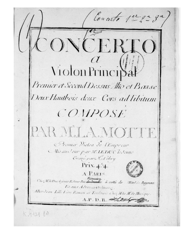| Alternative. Title | Concerto a Violon Principal, Premier et Second Dessus, Alto et Basse, Deux Hautbois, deux Cors ad libitum |