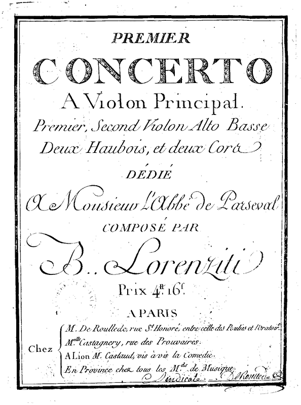 | Work Title | Premier concerto a Violon Principal, Premier second violon, alto basse Deux Hautbois et Deux cors |