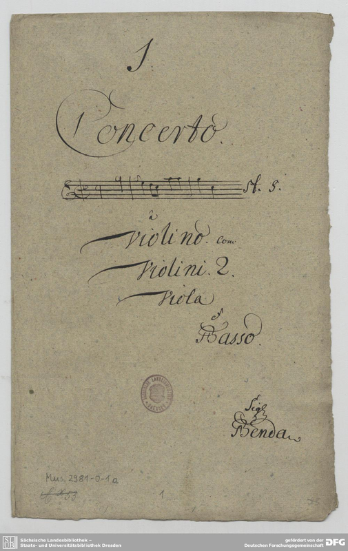 | Dedication | Johann Georg Pisendel (1687–1755) On solo part is written "V. Con. S. P.[isendel] / Benda". |