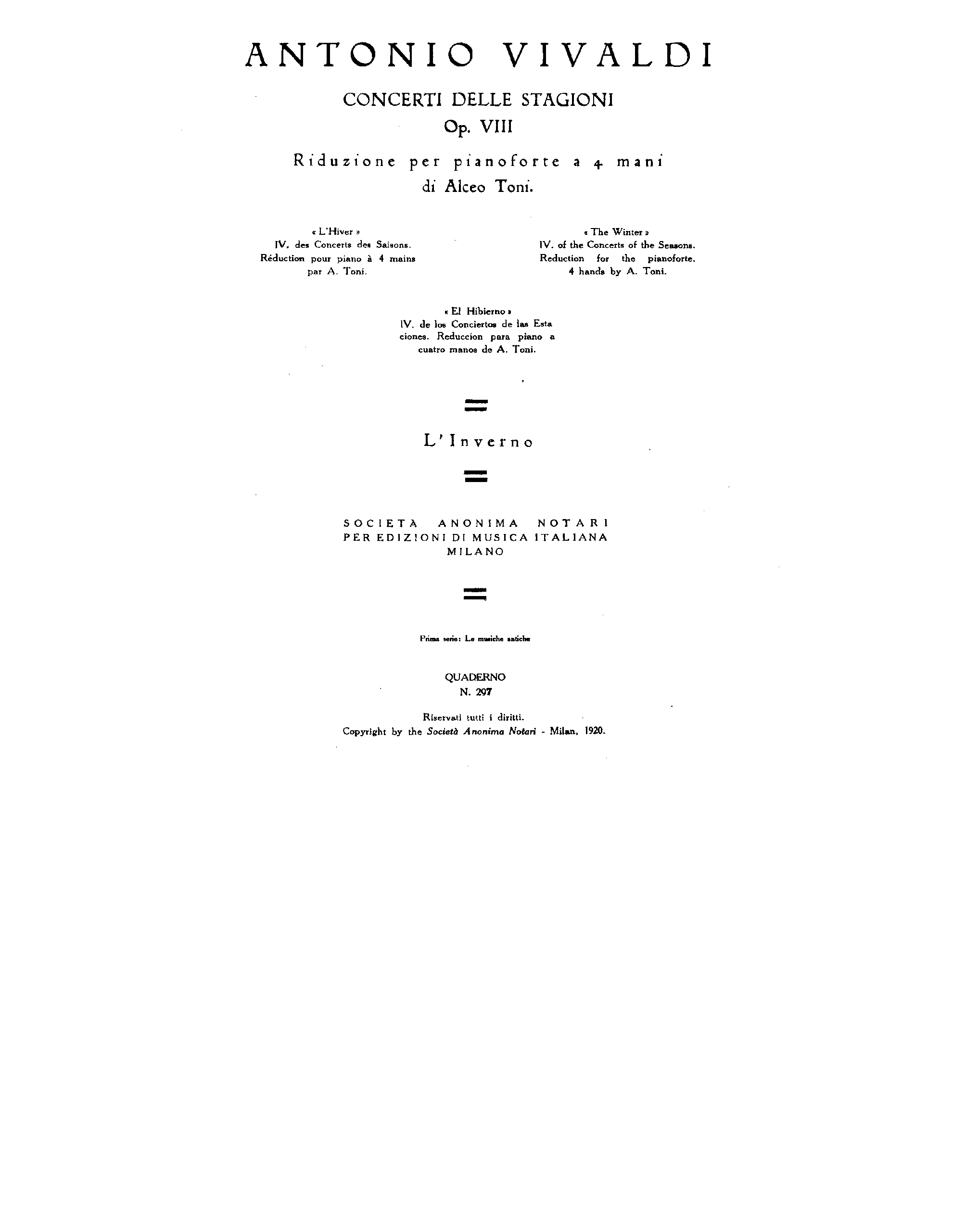 | Name Translations | Concerto No. 4 in F minor, Op. 8, RV 297; Concertos. Violon, orchestre à cordes, basse continue. RV 297. Fa mineur; Il cimento dell'armonia e dell'inventione. Konzert, RV 297; Концерт для скрипки, струнных и генерал-баса № 4 фа минор, соч. 8, RV 297 («Зима»); 協奏曲 第4番 ヘ短調 RV 297『冬』 |