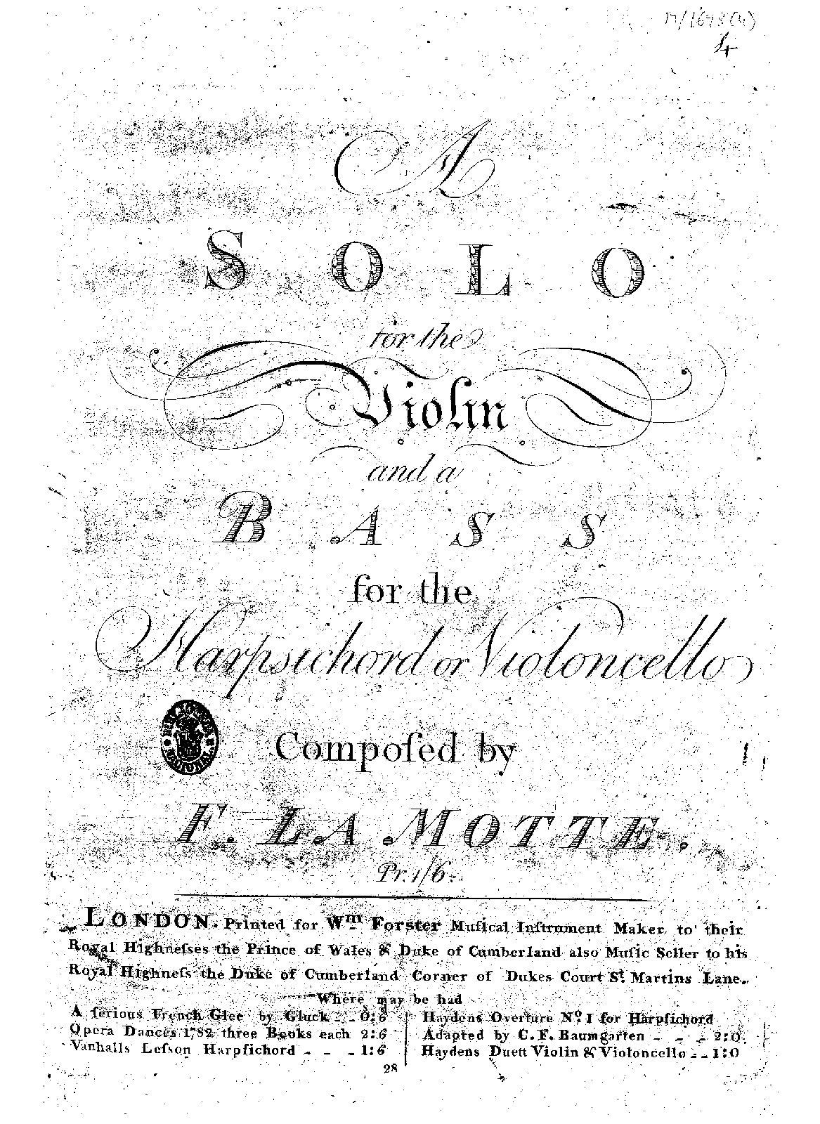 | Alternative. Title | Sonate pour le Violon avec Accompagnement de Basse; A solo for the violin and a bass for the harpsichord or violoncello |
