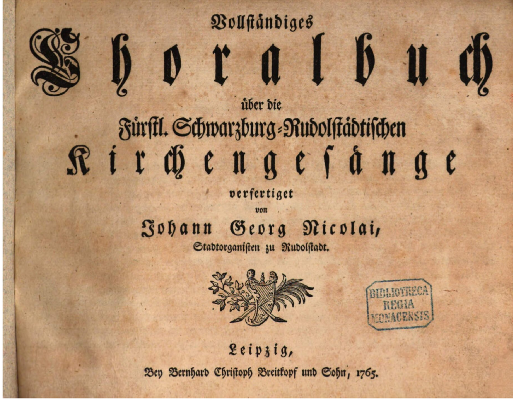 | Alternative. Title | Vollständiges Choralbuch uber die Furstl. Schwarzburg-Rudolstädtischen Kirchengesänge verfertiget von Johann Georg Nicolai |