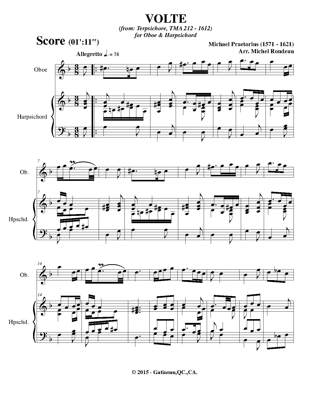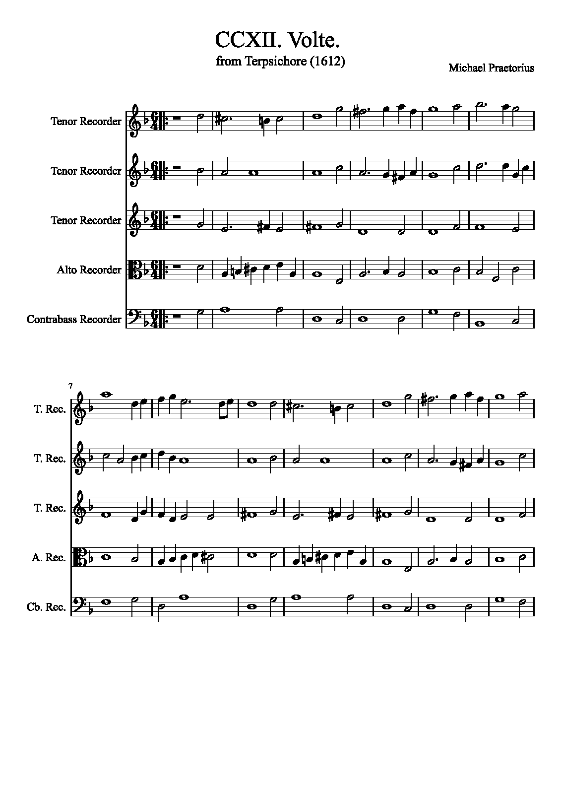 | Extra Information | These pieces were assembled and arranged by Praetorius for his 1612 collection. It is unknown how many, or if any, of the works in the collection were actually composed by Praetorius as opposed to being popular dance tunes arranged by him. The instrumentation is not specified in the original, and simply listed as "à 5". |