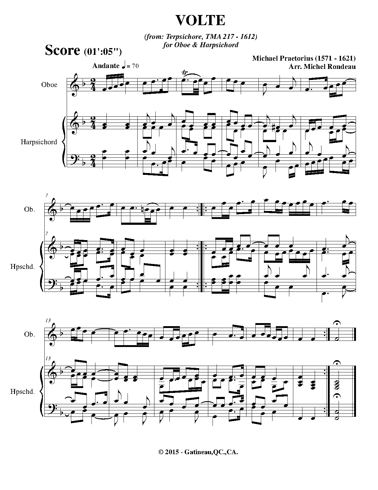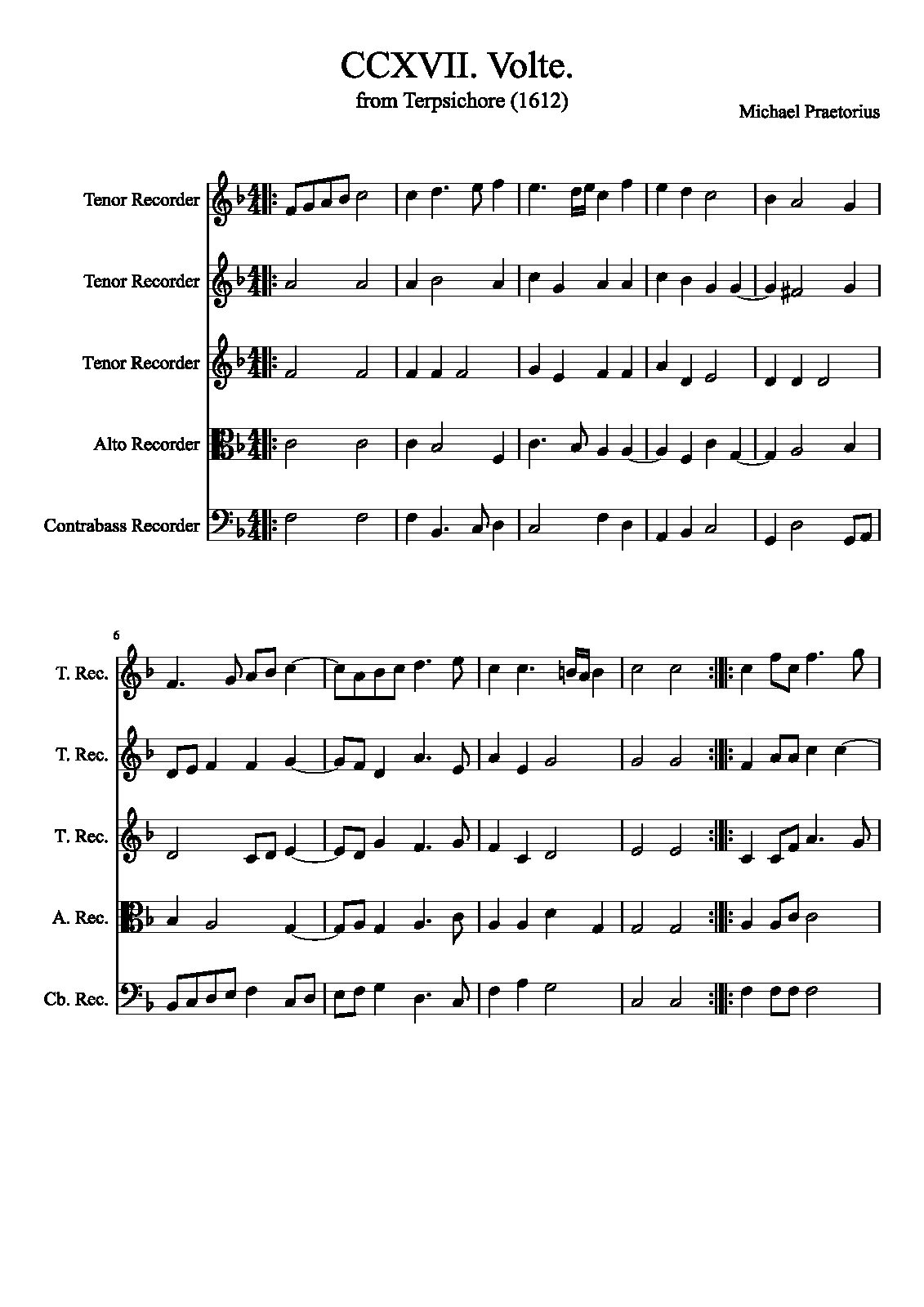 | Extra Information | These pieces were assembled and arranged by Praetorius for his 1612 collection. It is unknown how many, or if any, of the works in the collection were actually composed by Praetorius as opposed to being popular dance tunes arranged by him. The instrumentation is not specified in the original, and simply listed as "Ã 5". |