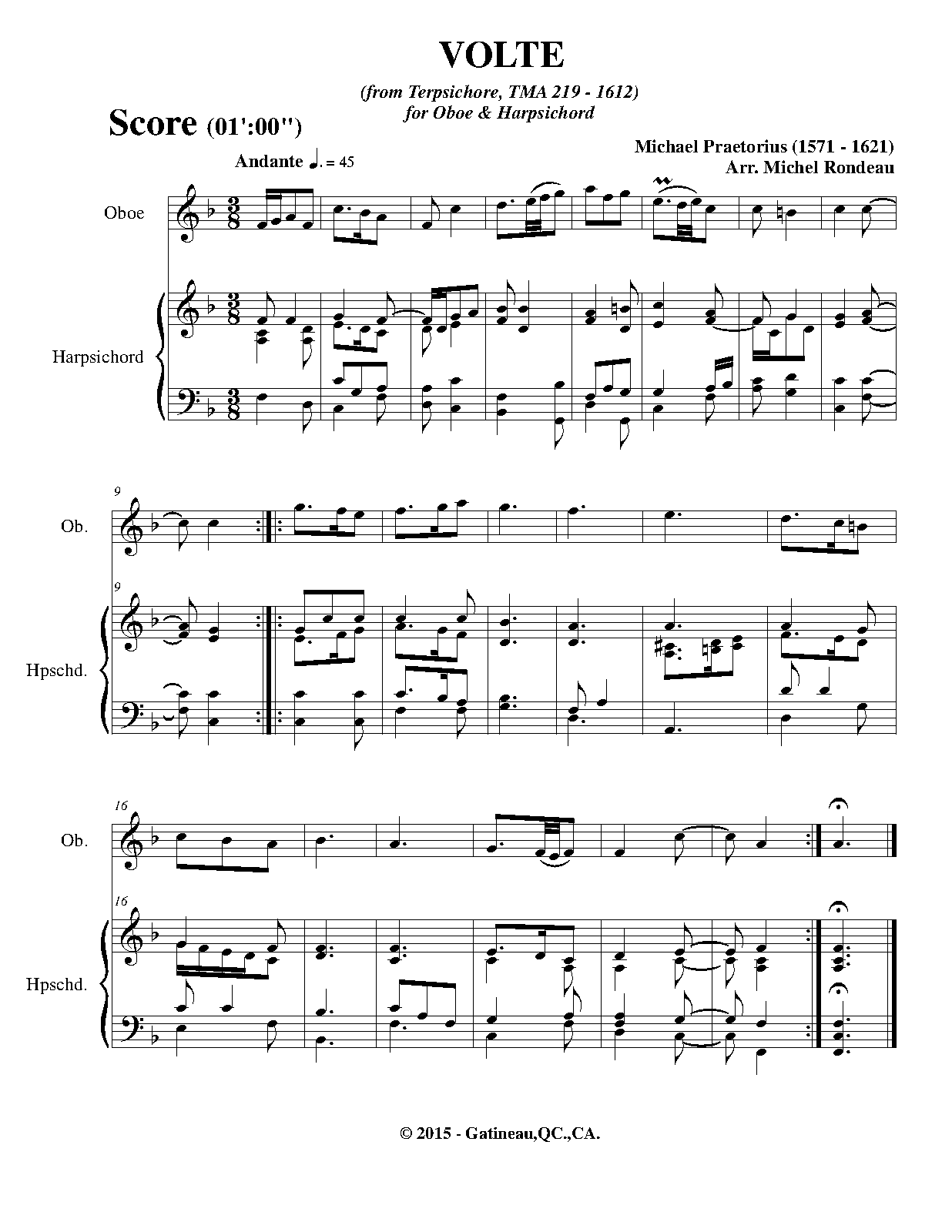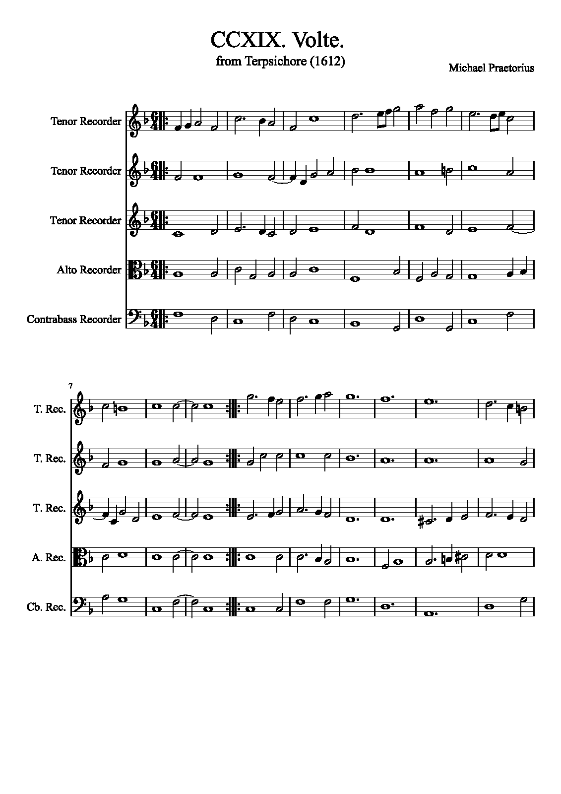 | Extra Information | These pieces were assembled and arranged by Praetorius for his 1612 collection. It is unknown how many, or if any, of the works in the collection were actually composed by Praetorius as opposed to being popular dance tunes arranged by him. The instrumentation is not specified in the original, and simply listed as "à 5". |