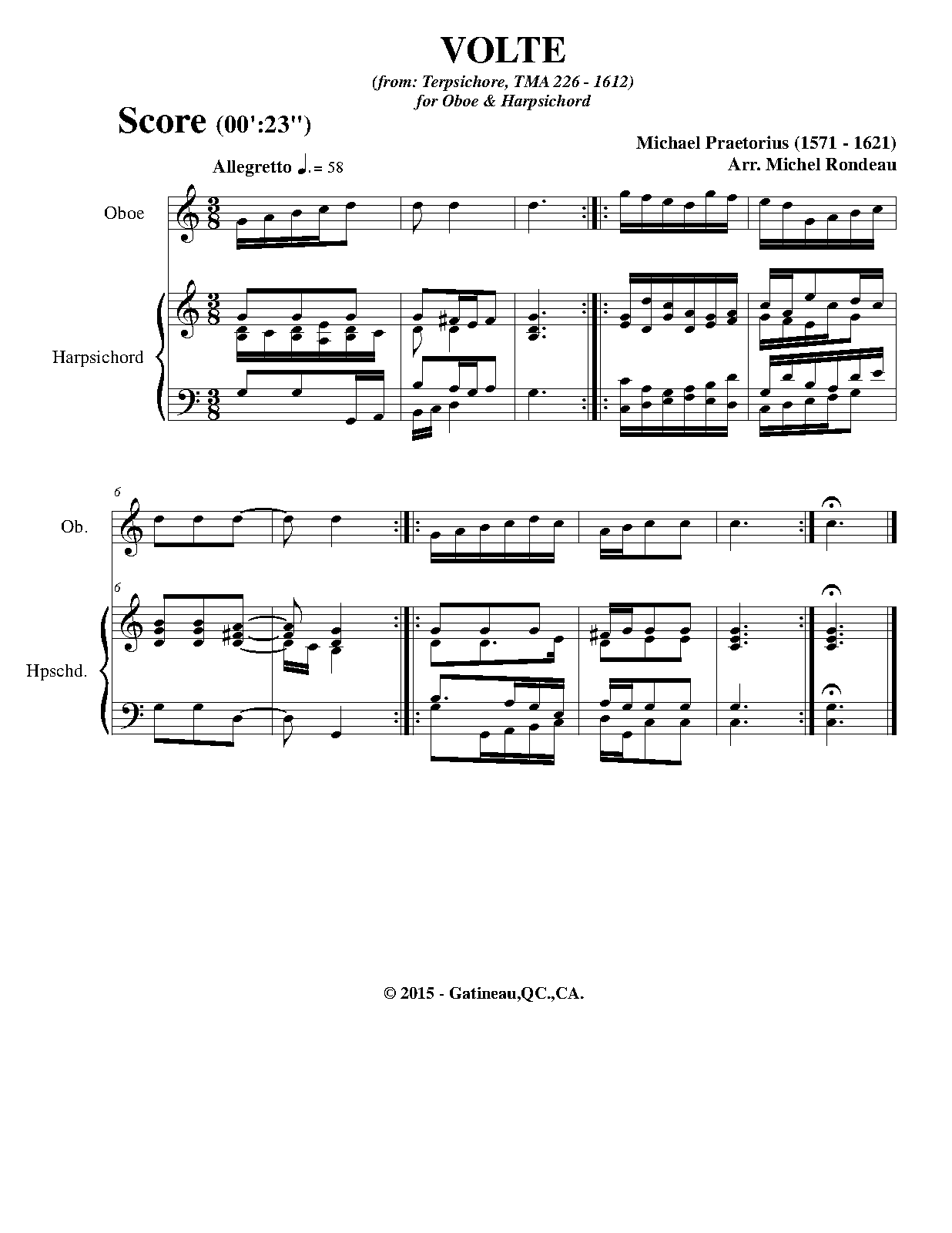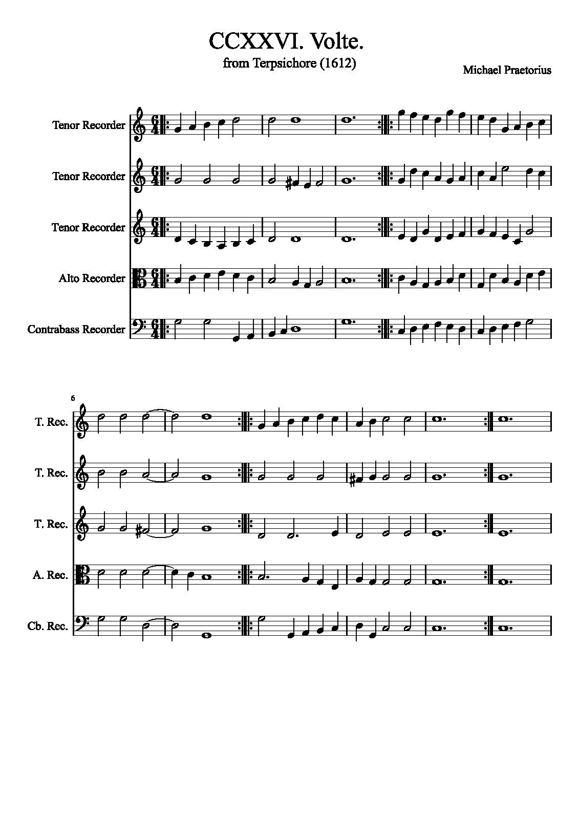 | Extra Information | These pieces were assembled and arranged by Praetorius for his 1612 collection. It is unknown how many, or if any, of the works in the collection were actually composed by Praetorius as opposed to being popular dance tunes arranged by him. The instrumentation is not specified in the original, and simply listed as "à 5". |