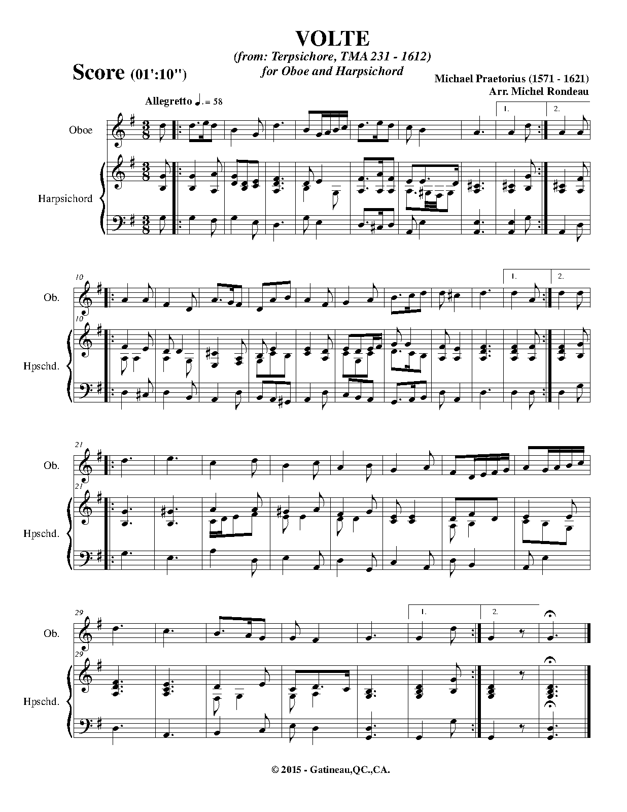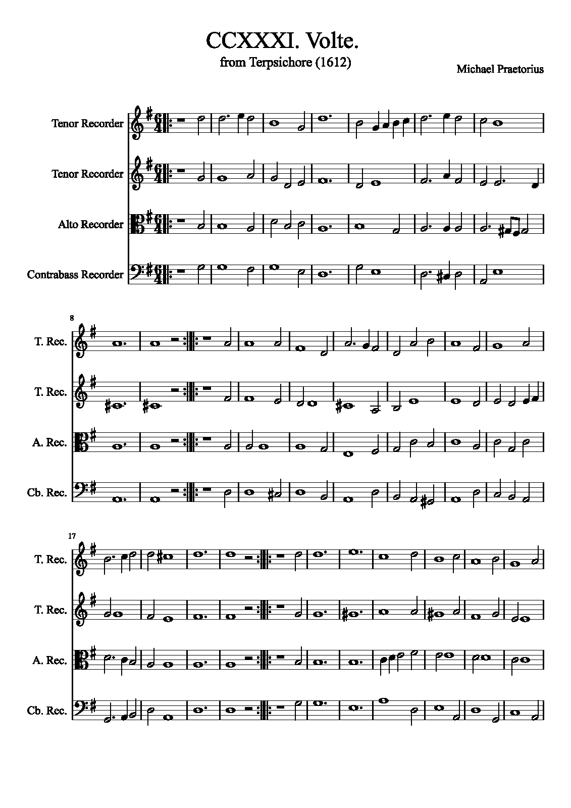 | Extra Information | These pieces were assembled and arranged by Praetorius for his 1612 collection. It is unknown how many, or if any, of the works in the collection were actually composed by Praetorius as opposed to being popular dance tunes arranged by him. The instrumentation is not specified in the original, and simply listed as "à 4". |