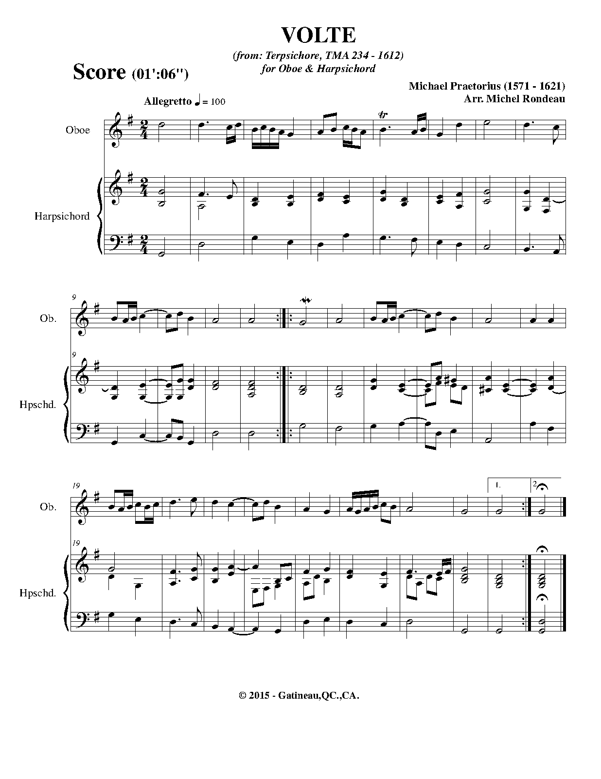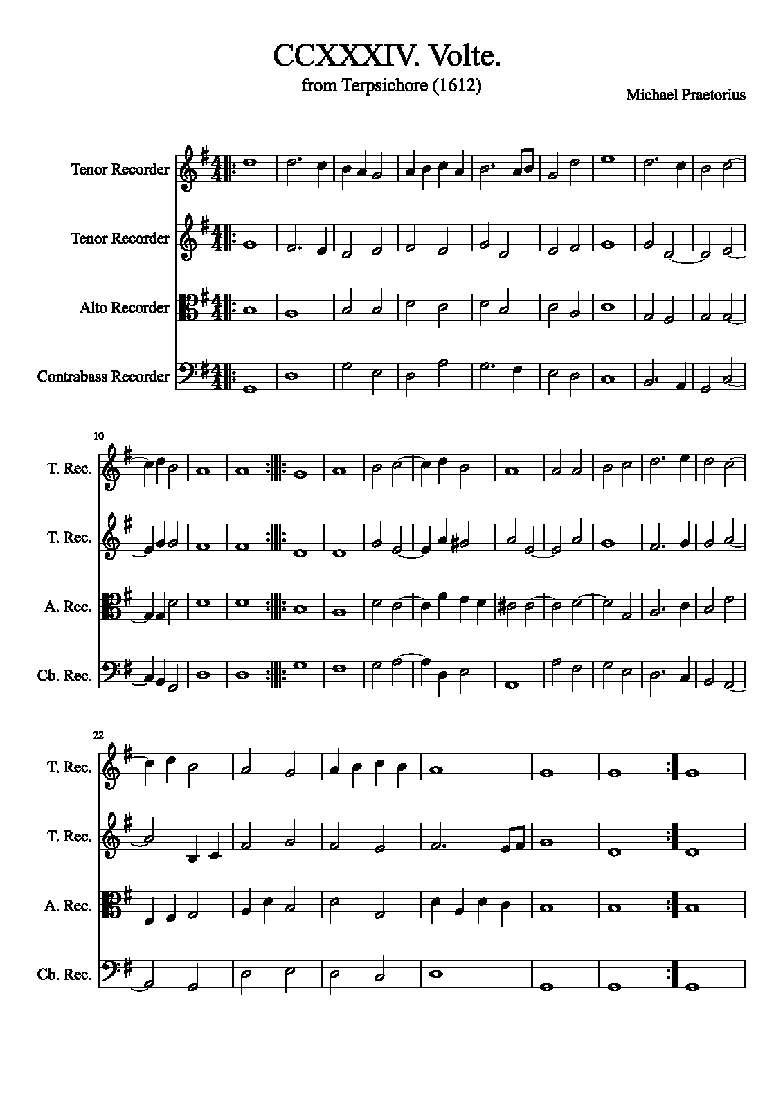 | Extra Information | These pieces were assembled and arranged by Praetorius for his 1612 collection. It is unknown how many, or if any, of the works in the collection were actually composed by Praetorius as opposed to being popular dance tunes arranged by him. The instrumentation is not specified in the original, and simply listed as "à 4". |