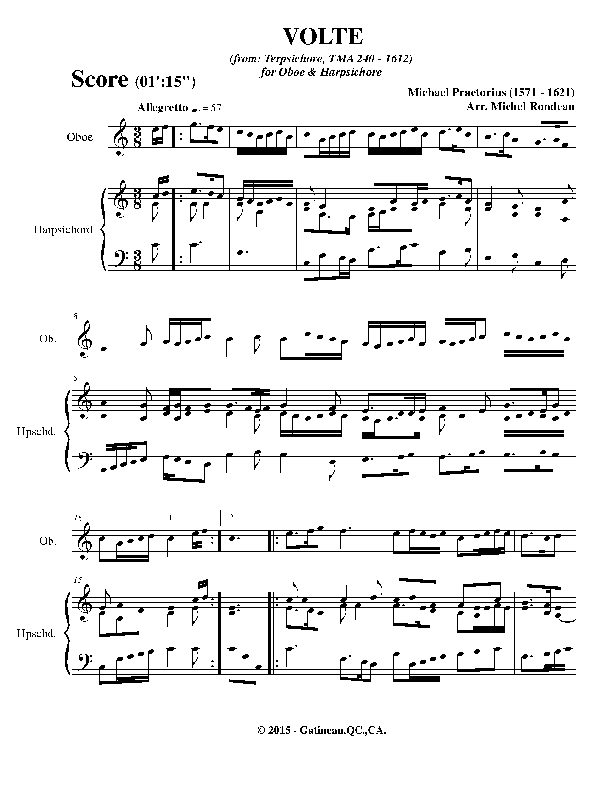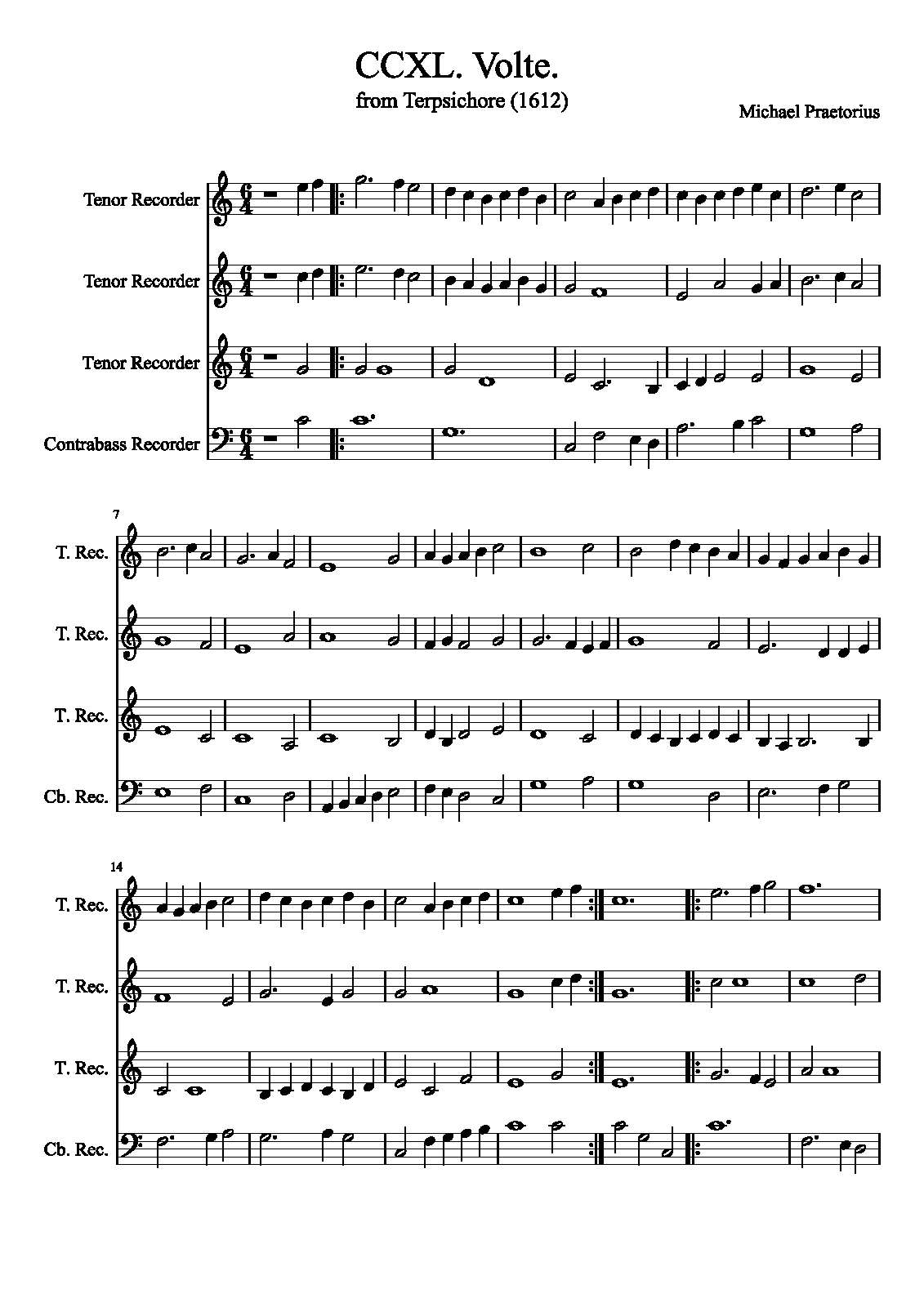 | Extra Information | These pieces were assembled and arranged by Praetorius for his 1612 collection. It is unknown how many, or if any, of the works in the collection were actually composed by Praetorius as opposed to being popular dance tunes arranged by him. The instrumentation is not specified in the original, and simply listed as "à 4". |