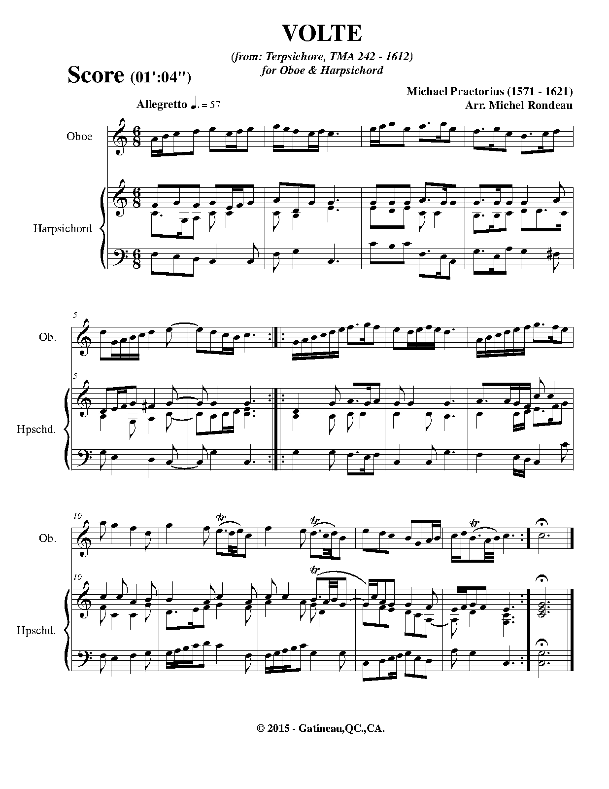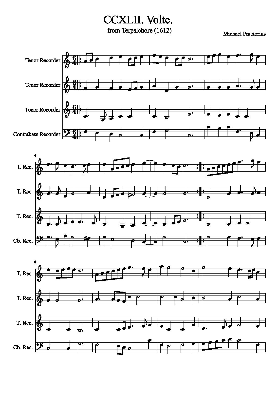 | Extra Information | These pieces were assembled and arranged by Praetorius for his 1612 collection. It is unknown how many, or if any, of the works in the collection were actually composed by Praetorius as opposed to being popular dance tunes arranged by him. The instrumentation is not specified in the original, and simply listed as "à 4". |