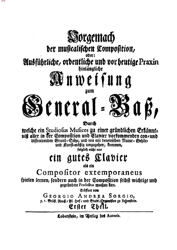 Vorgemach der musicalischen Composition, oder: Ausfuehrliche, ordentliche und vorheutige Praxin hinlaengliche Anweisung zum General Bass, durch welche ein Studiosus Musices zu einer gruendlichen Erkaenntniss aller in der Composition und Clavier vorkommenden con- und dissonierenden Grund-Saetze, und wie mit denenselben Natur- Gehoer- und Kunst-maessig umzugehen, kommen, folglich nicht nur ein gutes Clavier als ein Compositor extemporaneus spielen lernen, sondern auch in der Composition selbst wichtige und gegruendete Profectus machen kan.