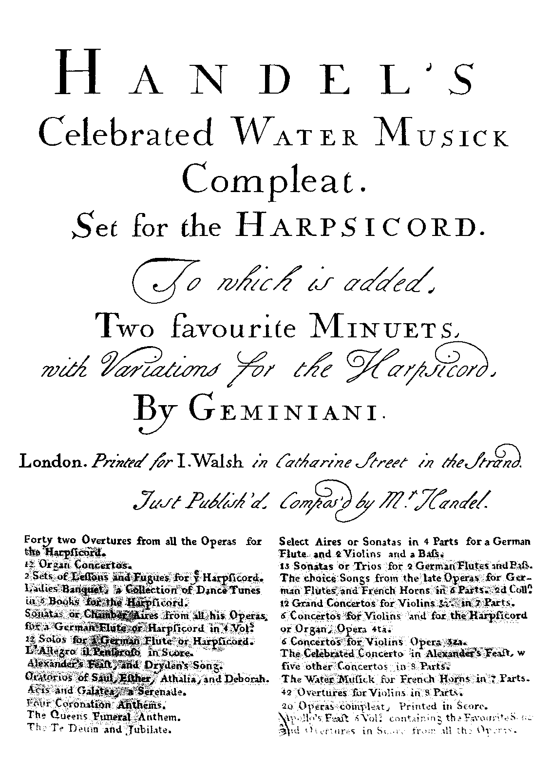 | First Publication. | 1733 - London: John Walsh (parts, 9 movements) 1788 - London: Samuel Arnold (full score, complete movements) |