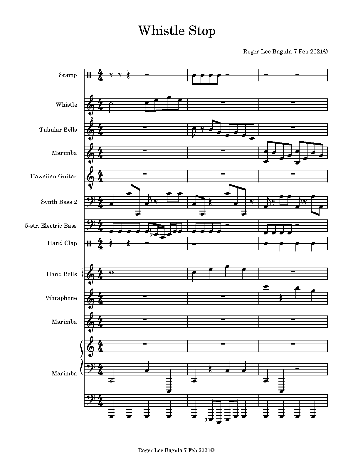 hand bells, guitar, whistle, bass, hand clamp, stomp, marimba