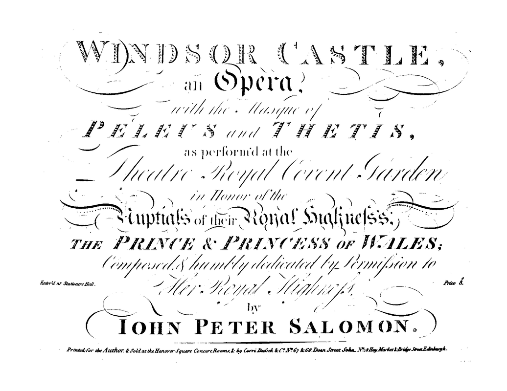 Alternative. Title Windsor Castle, an Opera with the Masque of Peleus and Thetis, as perform'd at the Theatre Royal Covent Garden in Honor of the Nuptials of their Royal Highness's [sic] the Prince & Princess of Wales