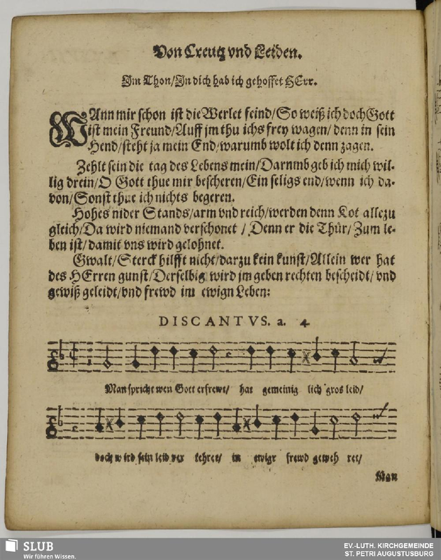 The melody evolved through later chorale books, notably the 1627 Cantional by Johann Hermann Schein ("Auf meinen lieben Gott"); this version later became attached to the "Wo soll ich fliehen hin" text.