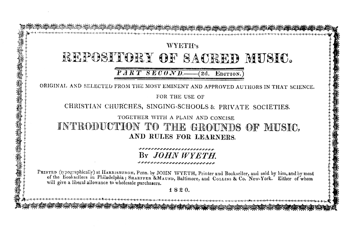 Wyeth's Repository of Sacred Music. Part Second. Original and selected from the most eminent and approved authors in that science. For the use of Christian churches, singing schools & private societies. Together with a plain and concise Introduction to the Grounds of Music, and rules for learners. By John Wyeth.