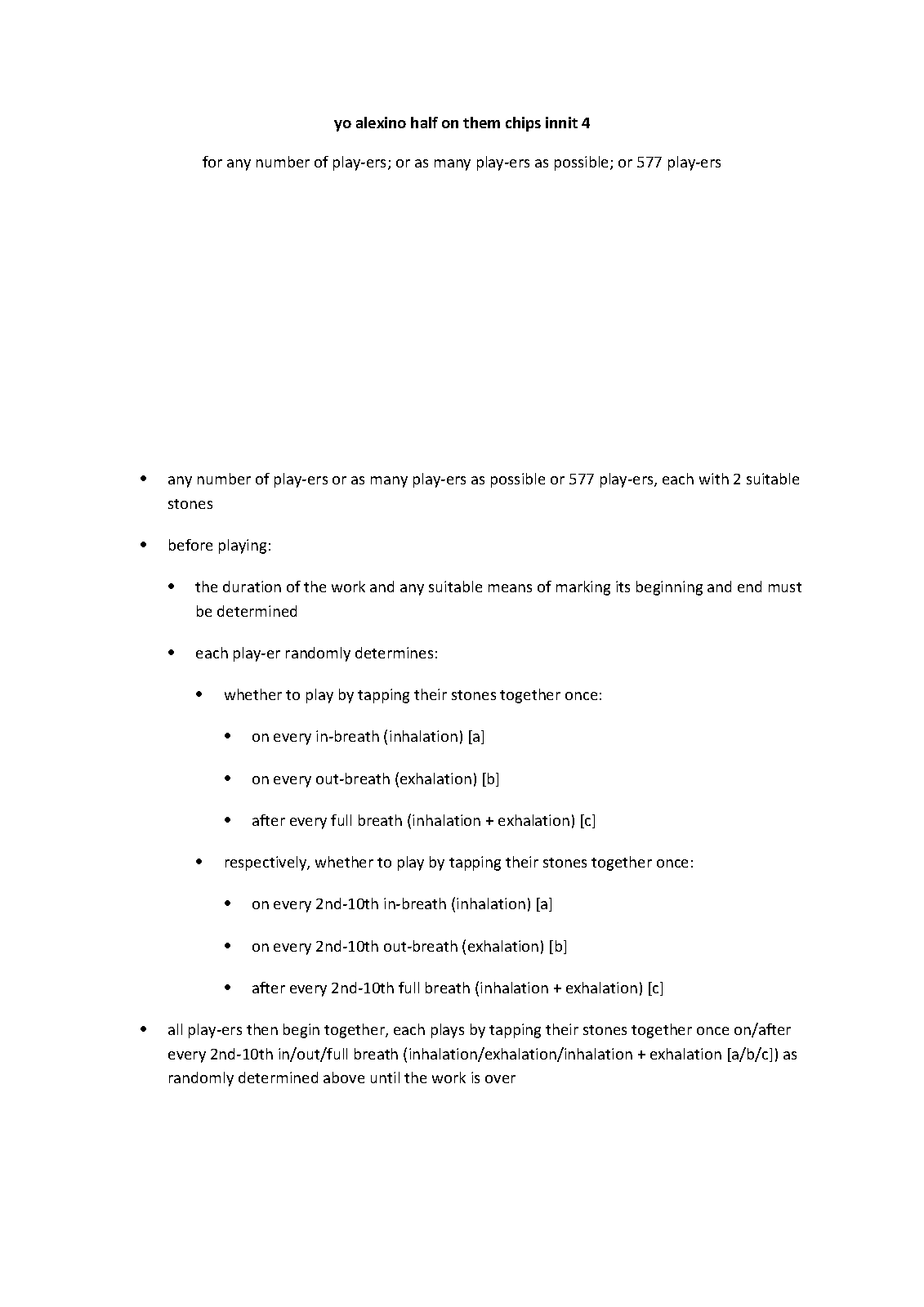 | Instrumentation | any number of play-ers or as many play-ers as possible or 577 play-ers, each with 2 stones |