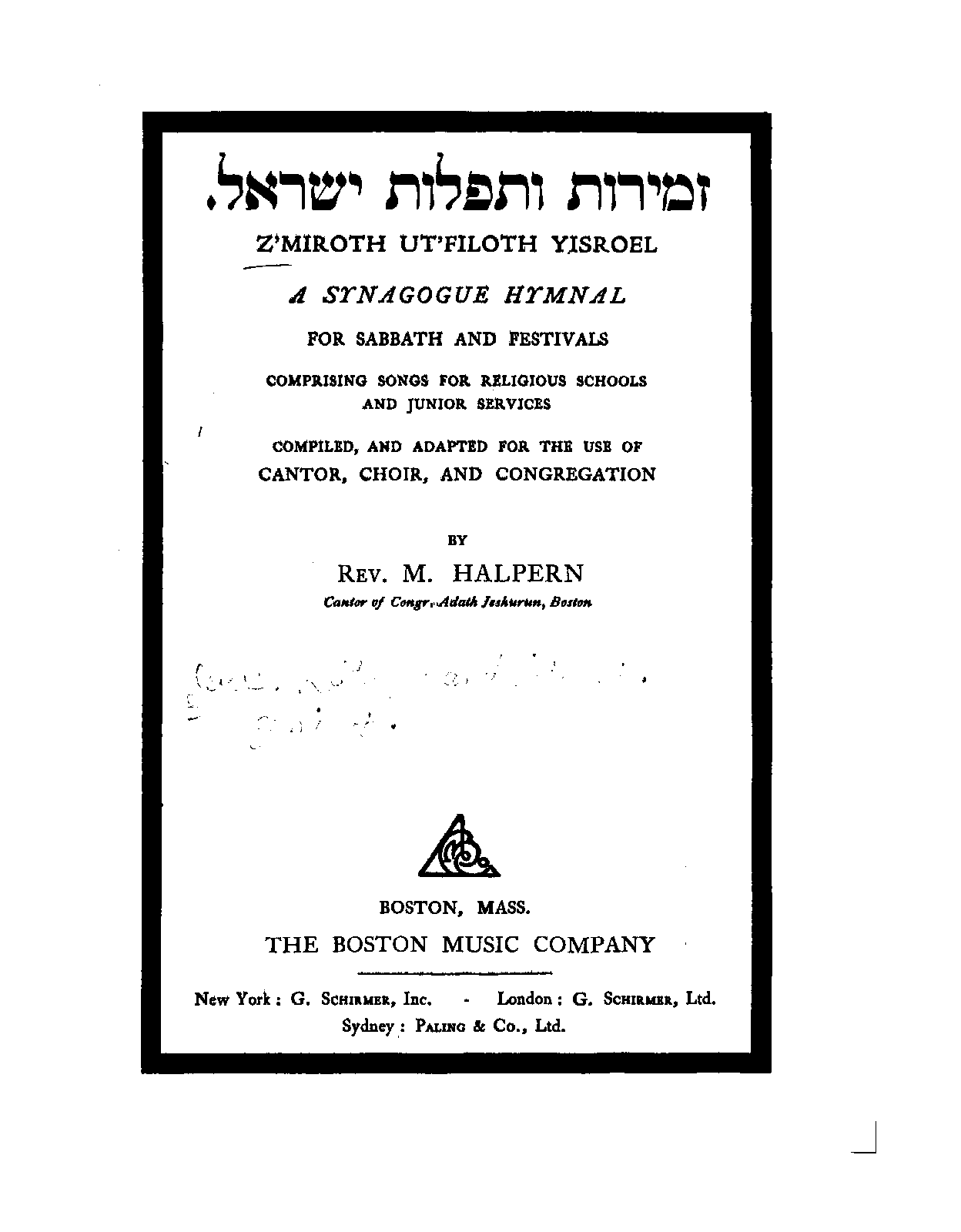 | Alternative. Title | Z'miroth ut'filoth Yisroel: A Synagogue Hymnal for Sabbath and Festivals, comprising songs for religious schools and junior services. Compiled, and adapted for the use of cantor, choir, and congregation by Rev. M. Halpern |